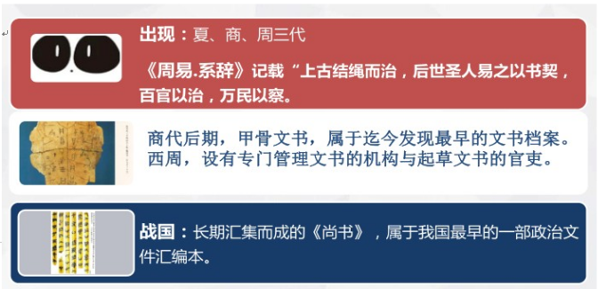2、商代后期:甲骨文書是我國迄今發(fā)現(xiàn)的最早的文書檔案;